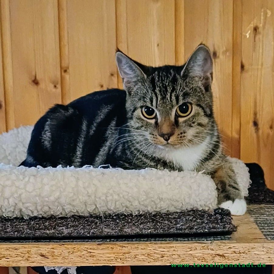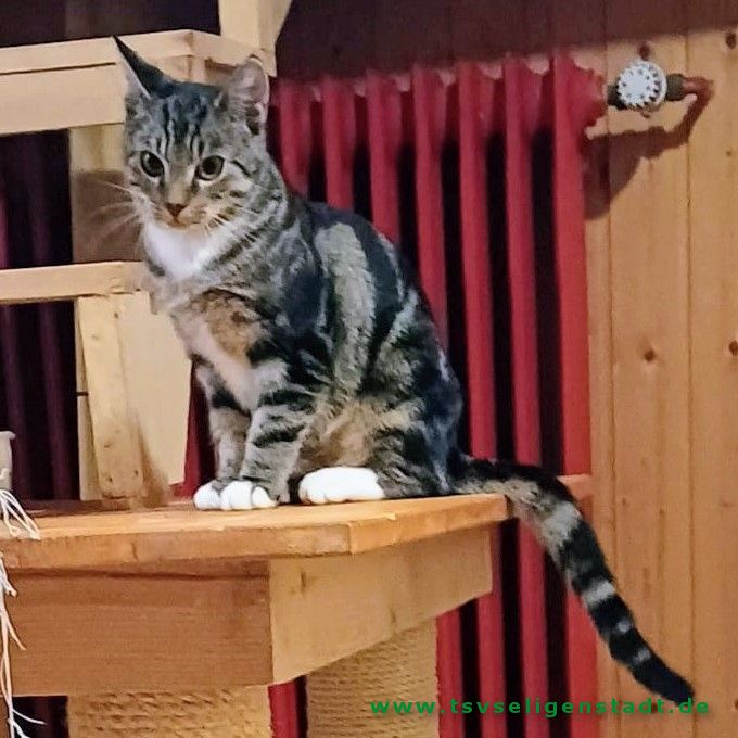 Dinie wurde Mitte August an einem Bahnhof gefangen, sie war sehr menschenscheu und ausgehungert. Dinie brauchte einige Wochen bis sie Zutrauen zu ihrem Pflege-Menschen fasste. Mittlerweile ist sie sehr verschmust und genießt die Streicheleinheiten. Dinie ist sehr aufmerksam und ihrem Alter entsprechend verspielt. Sie verträgt sich mit allen anderen Katzen. Allerdings ist sie bei Fremden noch sehr ängstlich. Sie braucht eine Familie, die ihr Geduld entgegenbringt und ihr Zeit zum Eingewöhnen lässt. Danach möchte sie dann in den Freigang in einer ruhigen Gegend